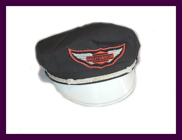 This is a wonderful vintage Harley Davidson biker hat/cap. It is in excellent condition. The top is black fabric with no fading. There is a very nice black, white and orange patch securely sew on the front.
