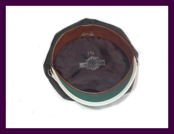 This hat is size 7 and 3/8. The inner lining is brown satin and is embossed with the "Harley Davidson Motorcycles" logo.